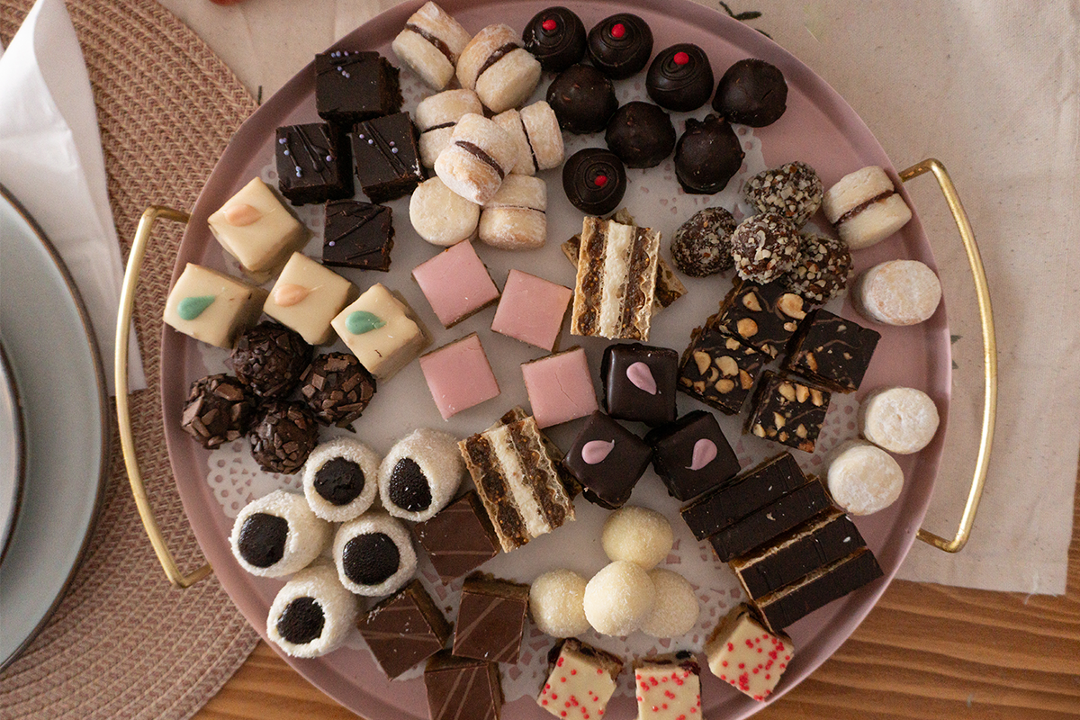Ako želite „svega po malo“, bez puno razmišljanja, naši fini domaći kolači su vaš mali, gotovi posni slatki sto u kutiji. Mešavina sadrži osam pažljivo izabranih kolača: čoko plazma minjon, čoko čeri kuglice, šumsko voće minjon, plazma kuglice, smokva panjiće, žarbo minjon, ferero roše i bajadera kocke.